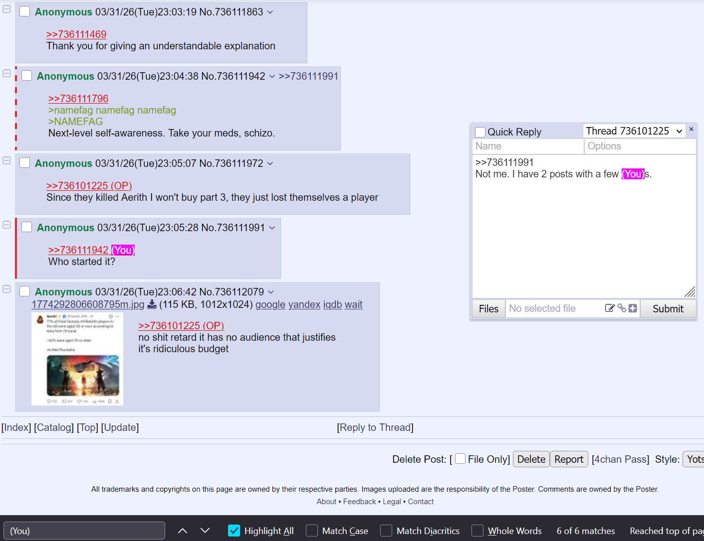 Still makes me laugh to this day that thia guys autism or whatever tricks him into always framing this as a war of VIIR and SE and the fans etc but he's always the one lone anon biting and bitching and sulking and eventually snapping over and over again and never does he think "wait, am I a retard for being the one guy, every single time, getting wound up? over the exact same things?"Look inward, I'm begging you. You are a lolcow. Why tell you this? Because you can't help it. You'll do it all again.