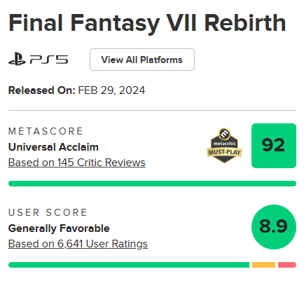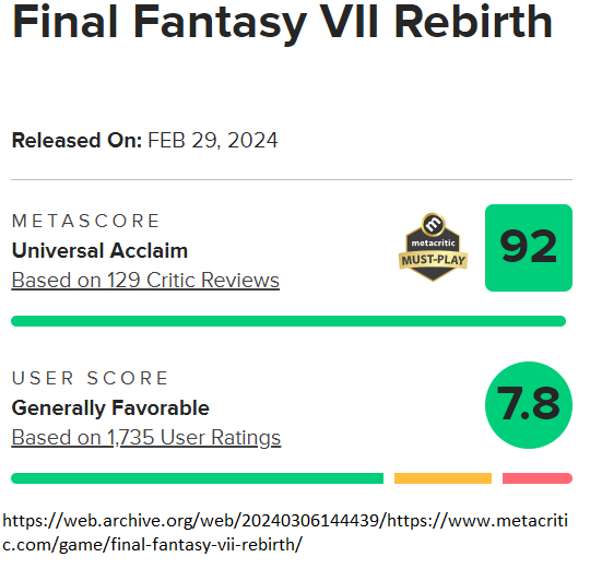 >>736129779Reviewers only gave it good score because "OH its FF7 the fucking classic! Look how great Clouds butthole looks in HD". And user reviewes are mostly 30-40 year old faggot fans who cant see furthee from their fandom smeared asses