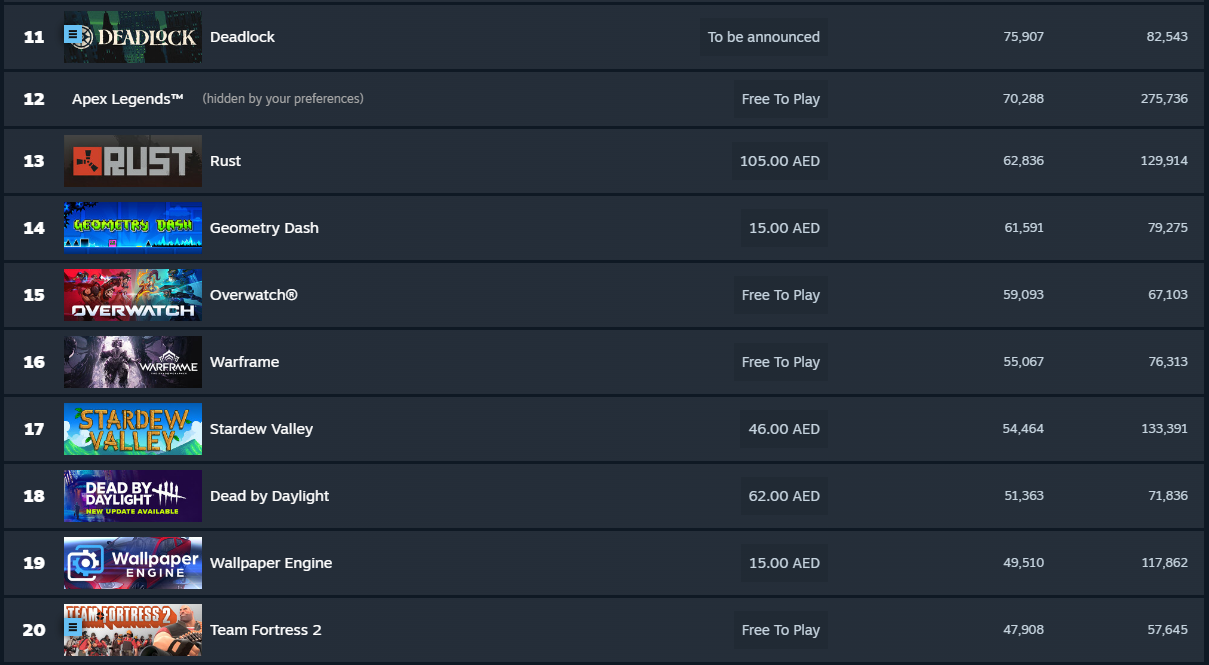 >>736147016Counterpoint 1:League of Legends (~30 mins games on average, for Deadlock it's 40)Counterpoint 2:They are developing casual modes like Brool or PvEI don't expect the game to challenge DotA or CS because those games have legacy fanbases and the current landscape of gayming to capture a new audience is quite competitive, but I think it'll be among the top 10 on Steam for a long time. All depends of course on how much and how long Valve are willing to support it, the crew working on TF2 became obviously tired of working on it after ~8 years