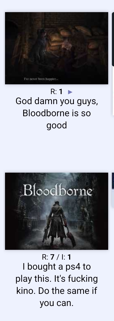 >>736126053>Redundant if you've already played DS3 and/or Elden Ring.nah they can't touch BB style and visceral feeling