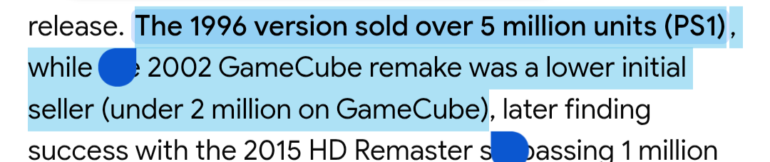 >>736151260>The Resident Evil HD Remaster (2015) reached over 1 million copies by April 2015, selling over 3.8 million as of 2023, while total combined sales (including GameCube) are over 6 million.