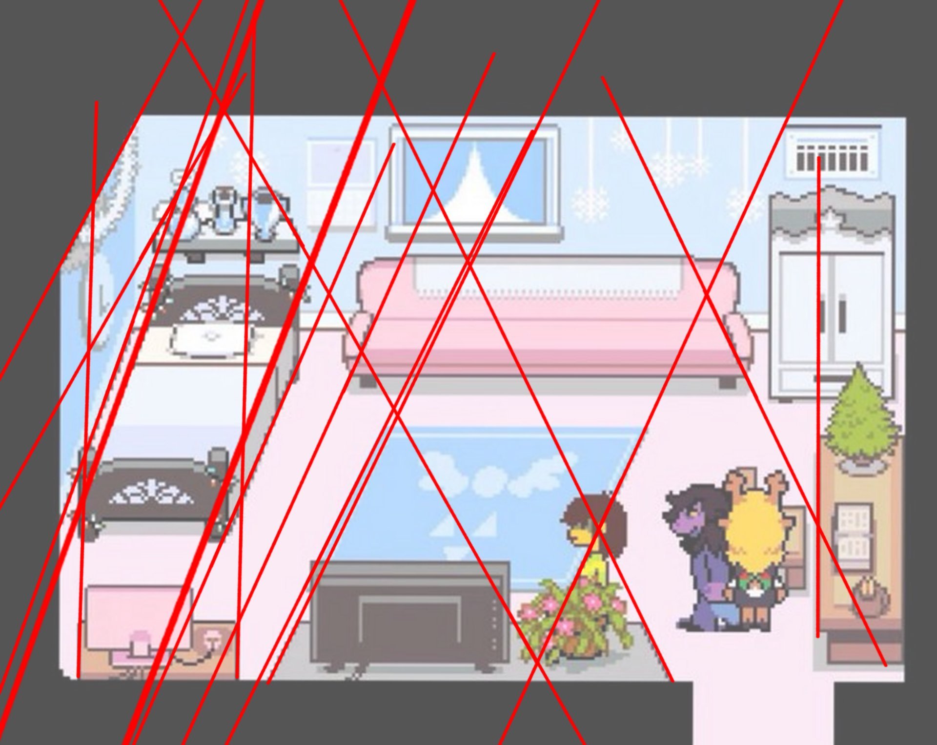 >>736131064Reminder that this is a sign that something about Noelle's bed or her left wall is going to be relevant later on in the game.The game doesn't normally do this perspective unless it needs that side of the room to be visible like that. Think Susie needing a visible locker to shove Kris against or the bathroom needing a side window for Kris to be able to sneak out through.