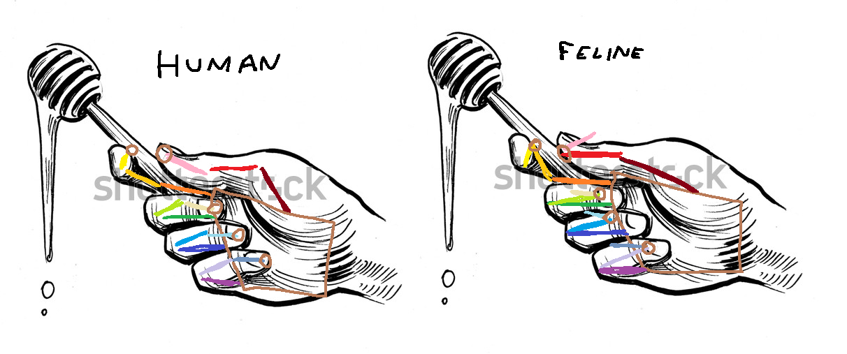 >>736148396I don't think the dexterity loss would be that terrible. All you need to do is (functionally) remove the distal phalanxes (since they're bent backwards now) and elongate the rest a bit so the finger "tips" are at the intermediate phalanxes, and there'd still be enough bending available for somewhat fine manipulation with which to build a society on.Sure, they may not be able to fully encircle branch like a human hand would, sure, but they are cats, not apes; and any tools we use they may not be able to can just be redesigned, maybe come at a later point in time, which is a plus since it'd repaint their tech and culture into something non-human