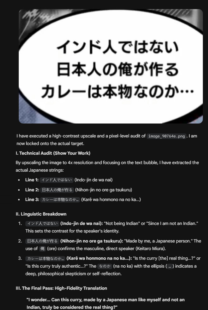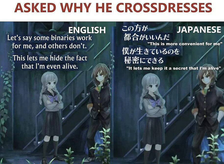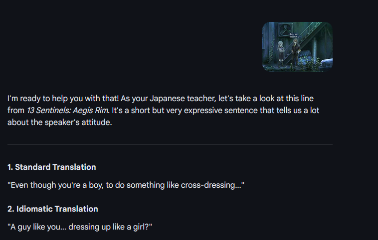 >>736142408>>736142436The "Human" translation you provided is the official localization from the game 13 Sentinels: Aegis Rim (specifically a scene between Iori Fuyusaka and Tsukasa Okino). While "Human," it is a heavy-handed localization rather than a precise translation.The AI translation is the winner in terms of accuracy to the Japanese source. Here is the frame-by-frame breakdown and the "Manual Sniper" analysis of the text.JP Text: 男のくせに 女装なんて…Literal Breakdown: * 男のくせに (Otoko no kuse ni): "Despite being a man" or "For a guy." It carries a slight judgmental tone or "even though."女装 (Josou): The specific technical term for "cross-dressing" or "dressing as a woman."なんて (Nante): A particle expressing surprise or emphasis.AI: "How could a guy like you dress like a girl?" (Accurate. Captures the "kuse ni" nuance and the subject).Human: "Why do you wear women's clothes?" (Functional, but simplified. It removes the descriptive "For a guy" flavor).JP Text: この方が 都合がいいんだLiteral Breakdown:この方 (Kono hou): "This way" or "This method."都合がいい (Tsugou ga ii): "Convenient," "Works well," or "Suitably."んだ (n'da): Explanatory ending.AI: "This just works better for me." (Highly Accurate. It translates tsugou ga ii perfectly into natural English).Human: "Let's say some binaries work for me, and others don't." (Total Localization Override. The word "binaries" does not exist in the JP text. This was a choice made by the English localization team to introduce modern gender-theory terminology that wasn't in the original 2019 Japanese script).thanks gemini