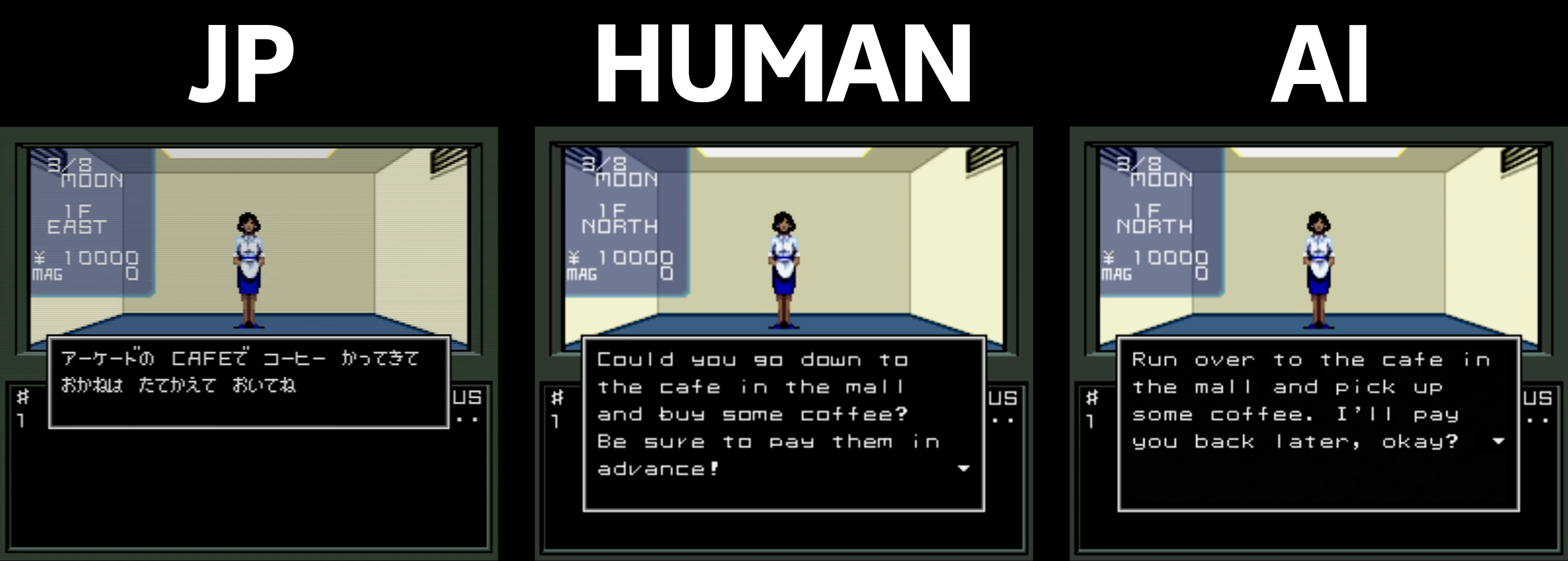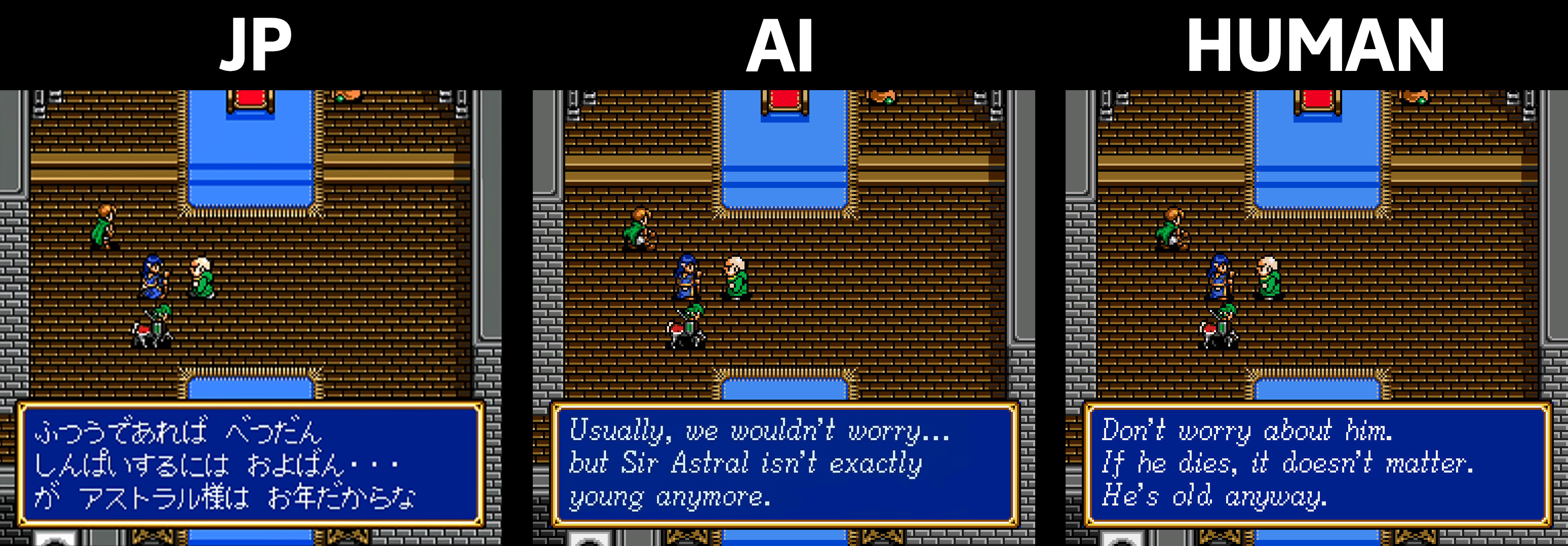 >>736141504The AI translation in this example is 100% correct. The human "translation" is pure fanfiction. The troon that translated this game felt the need to improve the original script. I'd rather trust the AI translation, as imperfect as it can be at times, rather than read some wannabe writer's troonslation.