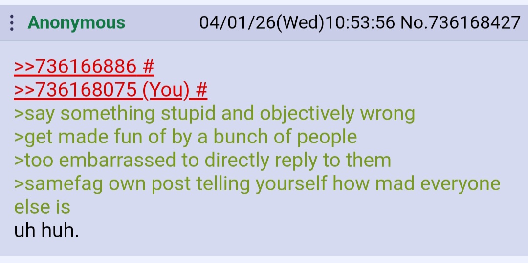 >>736166886>>736168075>say something stupid and objectively wrong>get made fun of by a bunch of people>too embarrassed to directly reply to them>samefag own post telling yourself how mad everyone else isuh huh.