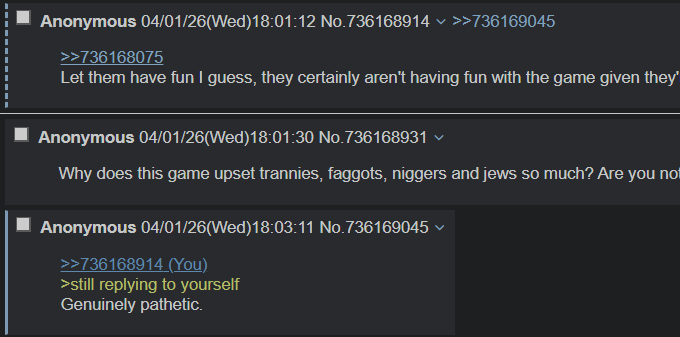 >>736167982They sit around for like 18 hours a day scanning for threads about this game, then ask bait questions to argue as a hobby for something, i don't really get itif nobody gives them (you)s they'll just make a post like>(quoting nobody) wait so you're saying this game is trash? it's peepoopoo garbage?then reply to themselves>yeah it's gooks lmaooo