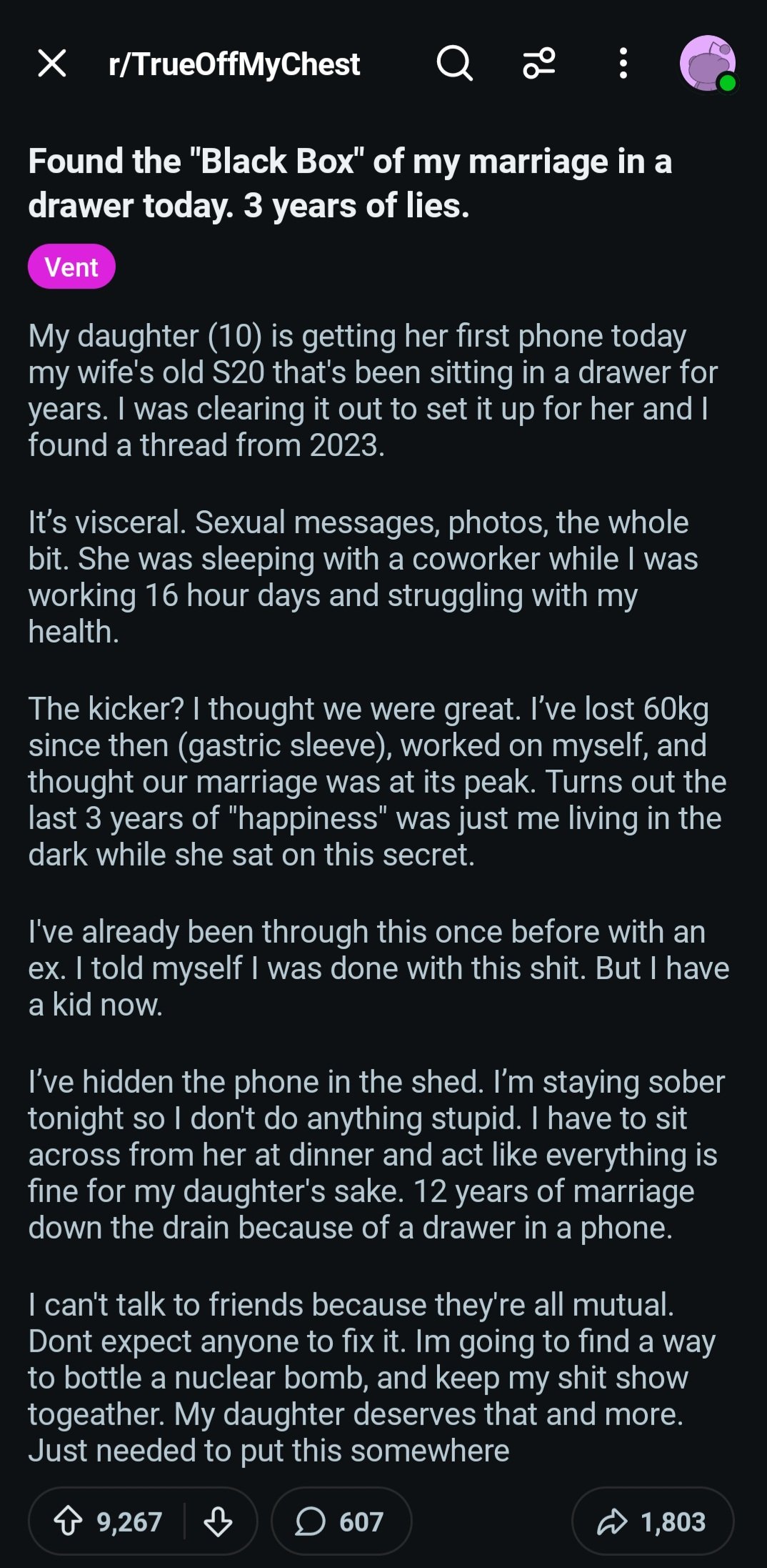I liked the NTR where the husband finds out that his wife never loved him as was cheating on him when they were still dating and the only reason she married him was because her bull master ordered her to,and the cuck's daughter isn't actually his but the bull's, and the "daughter" doesn't love the cuck at all but her real father,and they kept up this masquerade for over 25 years and finally dropped the bombshell on him on the day of the daughter' marriage and the cuck father was divorced and was banned from attending the daughter's marriage.then the cuck goes absolutely postal and kills everyone at the wedding event with a chainsaw including the bull, wife, and daughter.