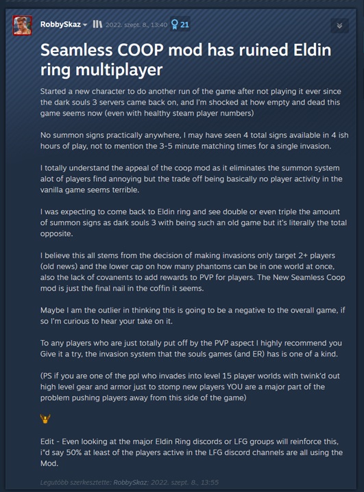 >>736167234agree, i remember when the game would just randomly disconnect you during coop and fuck playing through every area multiple times on each players world with friends>>736167496good thing only a small amount sweats take it seriously then, and the ones who still seethe about invasions years later.