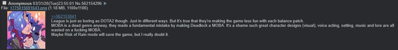 >>736157048People saying "I like this game but ooooh the pvp oooh the pvp" is something I've seen in just about every multiplayer vidya discussion ever. Here's an example I just saw in the /vg/ Deadlock thread. There was also the drama with Arc Raiders and PVE fans crying about other people using the PVP capacity of the game. There was also how people were begging for Overwatch to have a story mode for years on end and then the PVE content they got was pure ass.