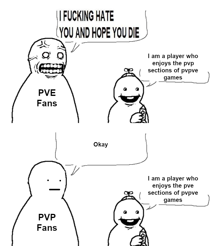 >>736156956in reality it goes something like>nah PvP ain't for me, i prefer to do things my own way>OH>MY>GOD