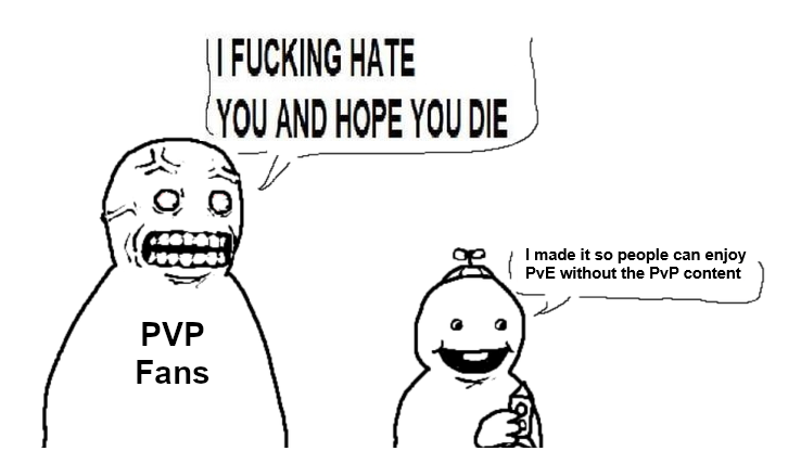 PVPfags don't want PVP. They want free kills.If you wanted PVP, you'd be playing unreal tournament or something along those lines.