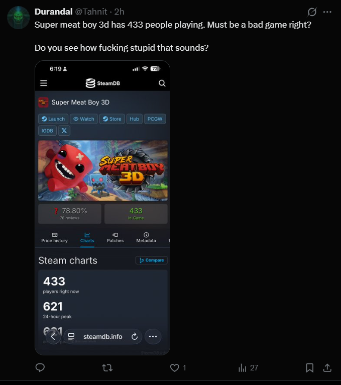 >>736161526this proof that games critics have literally no pull at all now. no one gives a shit if they like it, its barely getting 30k concurrent on steam, their positive reviews had no impact on player counts.