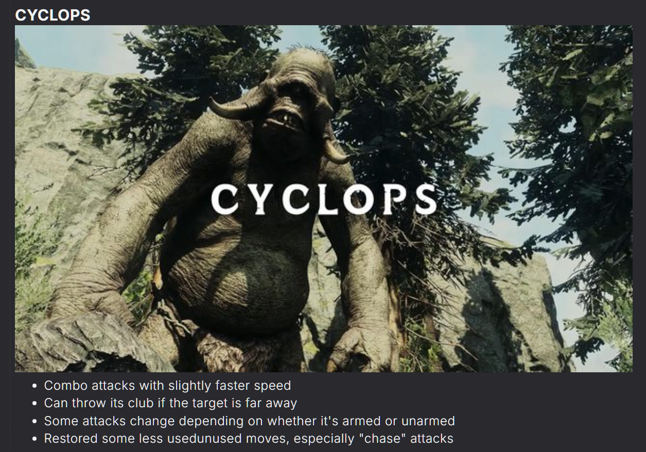 >>736179967>>736180654Does this mod make cyclopses not a joke anymore? It was always so weird to me how they're displayed as this super powerful monster but one heavenward sunder knocks them on their ass as I proceed to gouge their eye out. Not even armored cyclopses fix them being such a joke.