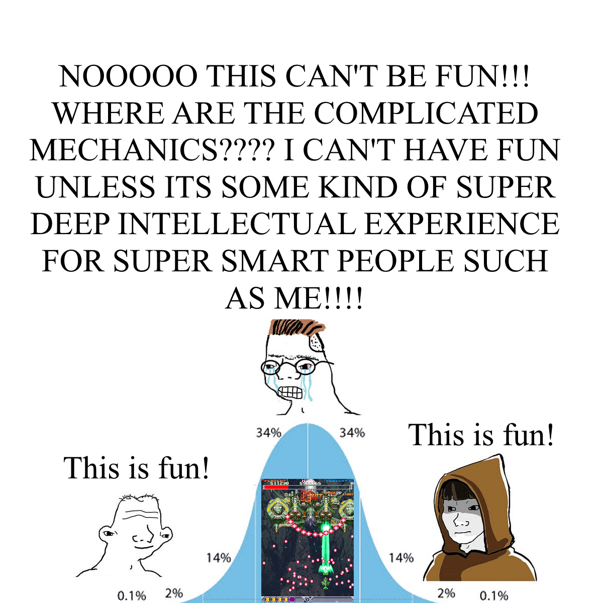 >>736179383pure gameplay doesn't matter if the gameplay is shitTake for example tetris - it's simple, but funnow look at something like bullet hell gamessimple? dependsfun? hardly - it's a shitty mess that's hard for they eyes, winning is simply holding shoot button while focusing 100% of your efforts on staying in some pitifully tiny "safezone" inside a cage of bullets