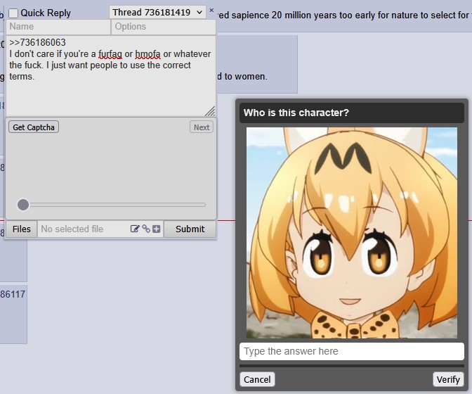 >>736186063I don't care if you're a furfag or hmofa or whatever the fuck. I just want people to use the correct terms.
