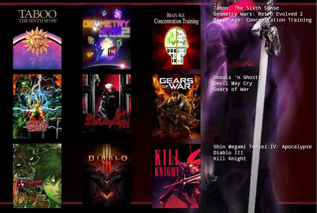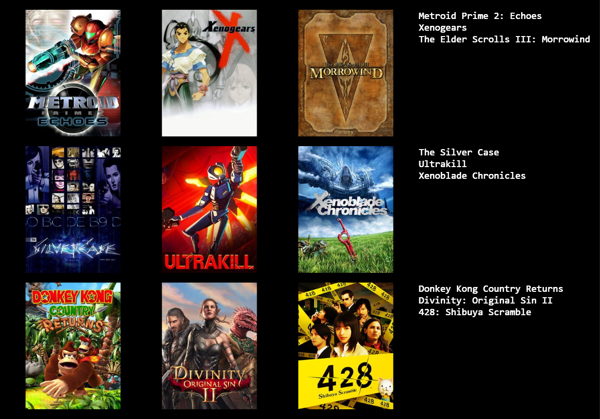 Without including any games that are meant to impress others and just focusing on what I enjoyed most thanks to being in the right headspace, these are my favorites I suppose.I should include more games from my young childhood, but I'm having a difficult time remembering how much I truly liked them.