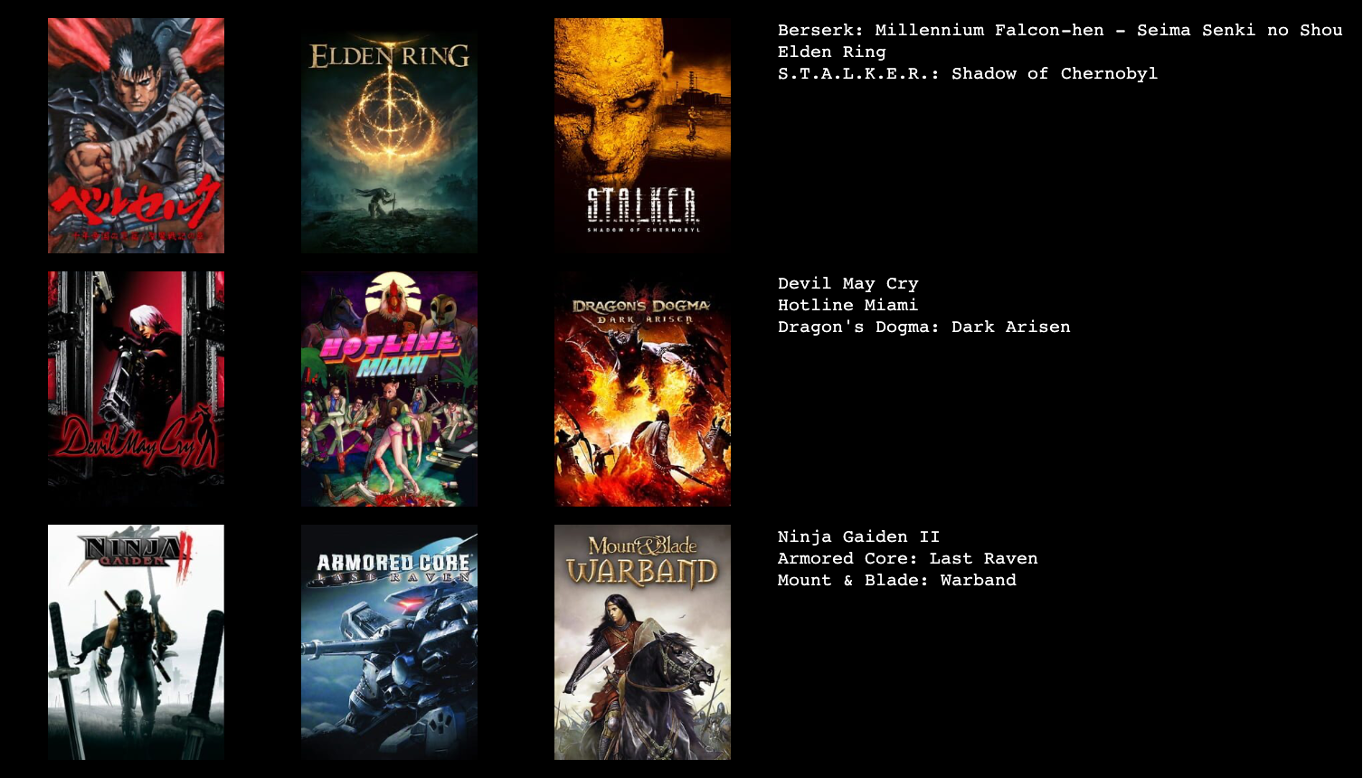 'sup, my niggas.>>736182852+Two Towers, Halo 2, S&P, Stranger of Paradise, EchoesDope
