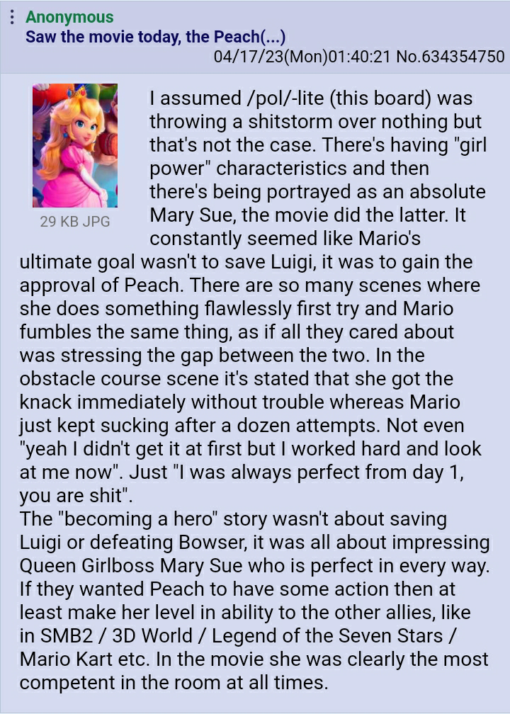 People are still white knighting for movie Peach?Holy fuck give it a rest she's a girlbossing Mary Sue & a cold fish she's nothing like game Peach. God I hate living in this Gynocentric shithole of a planet.