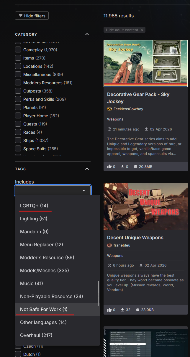 >>736198775Tags are unreliable on that site since not everyone properly tags their mods. Select the "show only adult content" box next time