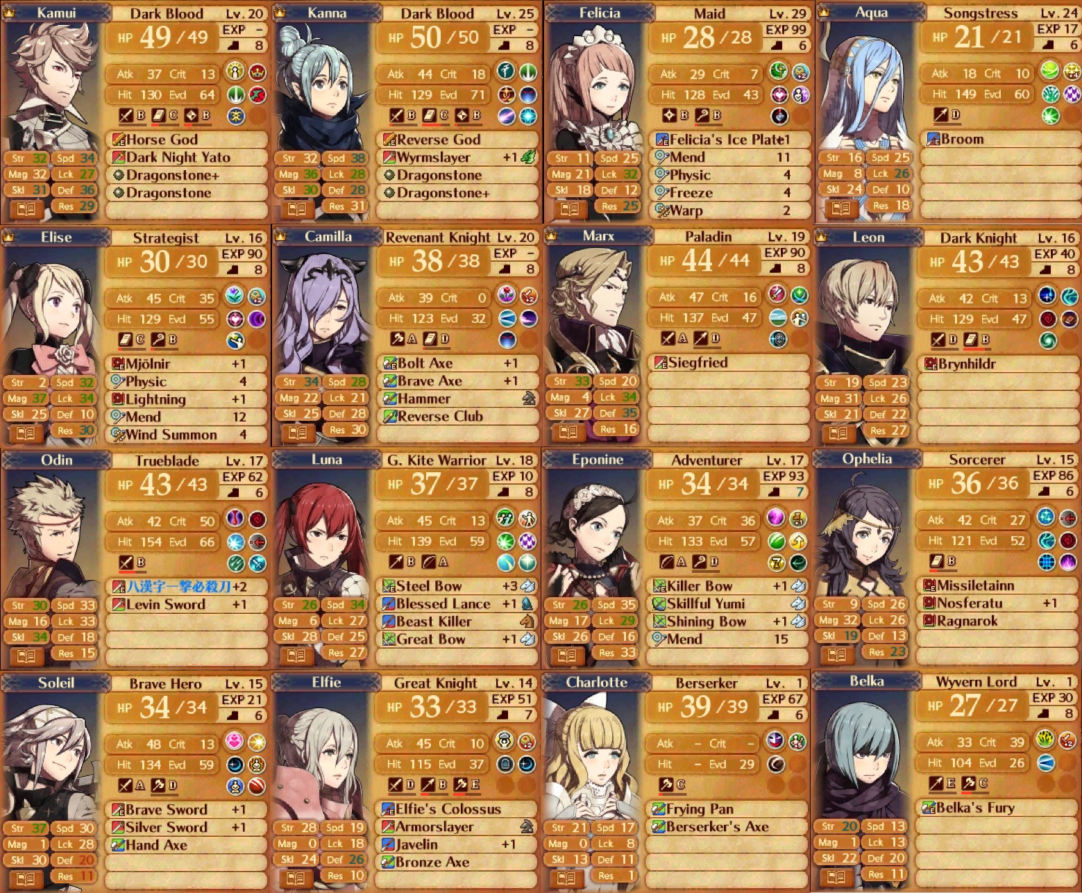 here were my characters by the end of the game. I tried to make kanna invincible, but her def cap was too low so it didn't really work. felicia's magic growth was too low and had zero bulk so she was useless aside from healing and occasionally sneaking in a debuff with attack stance. elise was also responsible for like half of my map retries, but at least she could kill stuff. camilla was good for the entire game, but leon and marx kind of fell off because of low speed. odin and eponine were both solid with killer weapons and hybrid attacking. ophelia was ok offensively but I never was able to use her to tank with nosferatu like I wanted. I did everything I could think of to make luna good, but she was never any more than just ok. soliel ended up really strong after I gave her an arms scroll so she could finally equip a brave sword. the last 3 were just backpack characters even though I tried to actually use elfie but her defense grown couldn't keep up.everyone will probably tell me I built all of these characters wrong, but I wanted to use a variety of classes and characters instead of just having a handful of interchangeable juggernauts with their back pocket characters who never got to do anything.