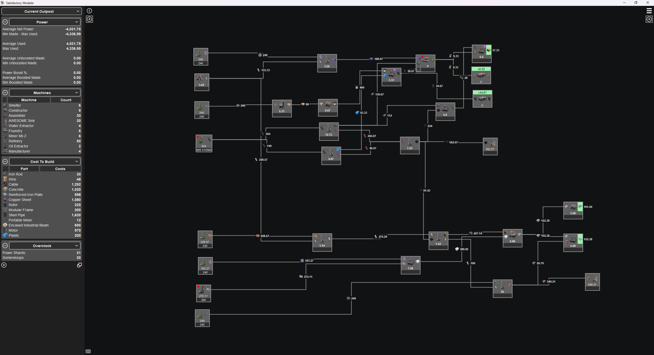 >>736205843Another great thing about Satisfactory is you got this fantastic FREE program called Satisfactory modeler that lets you plan out factories. You can plan from the end product or you can start from the input such as ore and see what you can produce. There's no better tool out there.