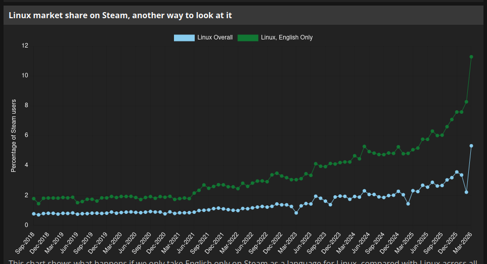 It's just the Steam Deck propping the number up. Linux gaming will never be a thing without gaming dedicated hardware that comes with it preinstalled.