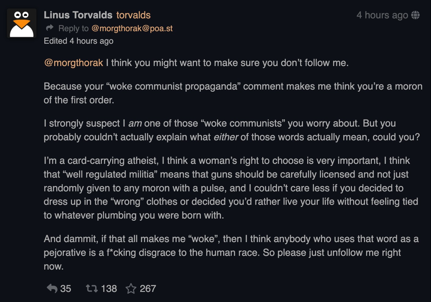 >>736217284>Also, just wait till you have 100,000 pajeets hop on linux and then completely shit all over the open source code and flood the current active community devs with shitty pull requests.We have already reached that point and then some: https://www.theregister.com/2026/02/12/ai_bot_developer_rejected_pull_request/https://www.theregister.com/2026/03/26/greg_kroahhartman_ai_kernel/And pretty much any news involving Copilot & GitHub.