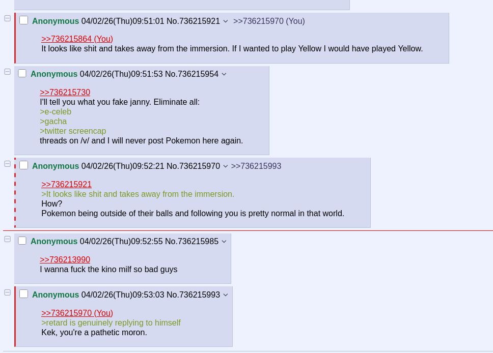 >>736215730I'll tell you what you fake janny. Eliminate all:>e-celeb>gacha>twitter screencapthreads on /v/ and I will never post Pokemon here again.
