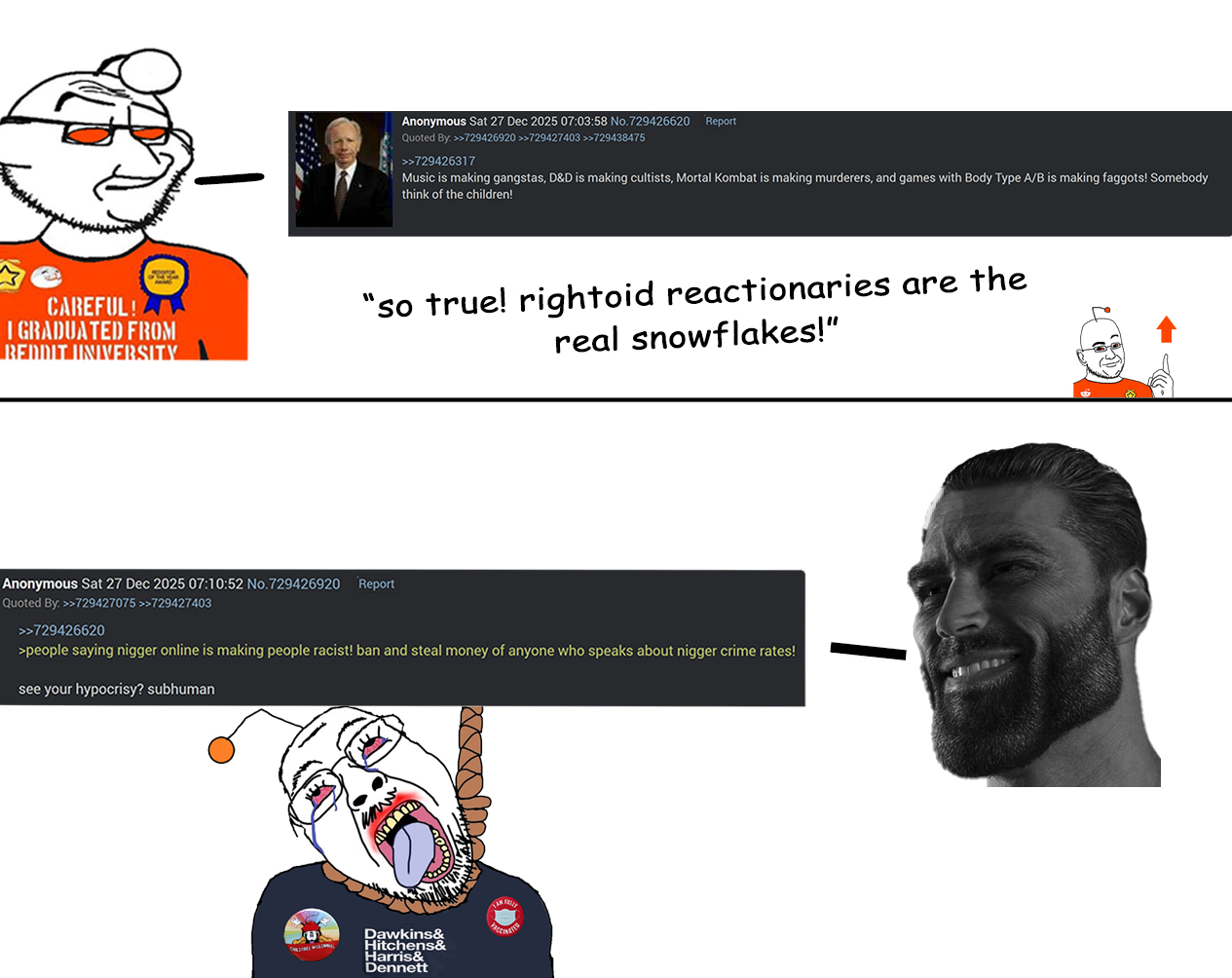 >>7362144054chan is a fascinating place. Did you know that simply questiong the rules of the website or the moderators results in a ban? And racism is against the rules on all boards, as is off-topic threads, and the only board where discussing 4chan rules was on topic was /QA/, which was removed. So not only is complaining about racism being against board rules, simply telling people that racism is against board rules is enough to get a ban. That's silencing of dissent and restricting the circulation of its evidence. And through digital maleugenics, it leaves all the retarded irrational troons who go along with everything jannies say and who downplay and gaslight you over the censorship.