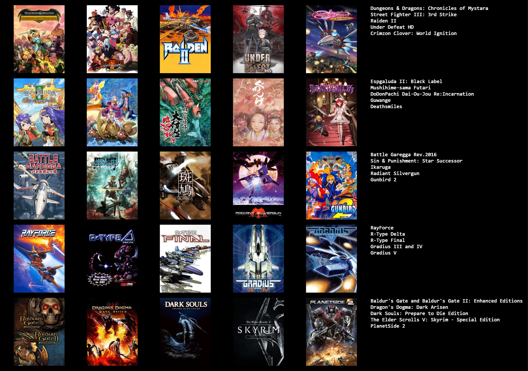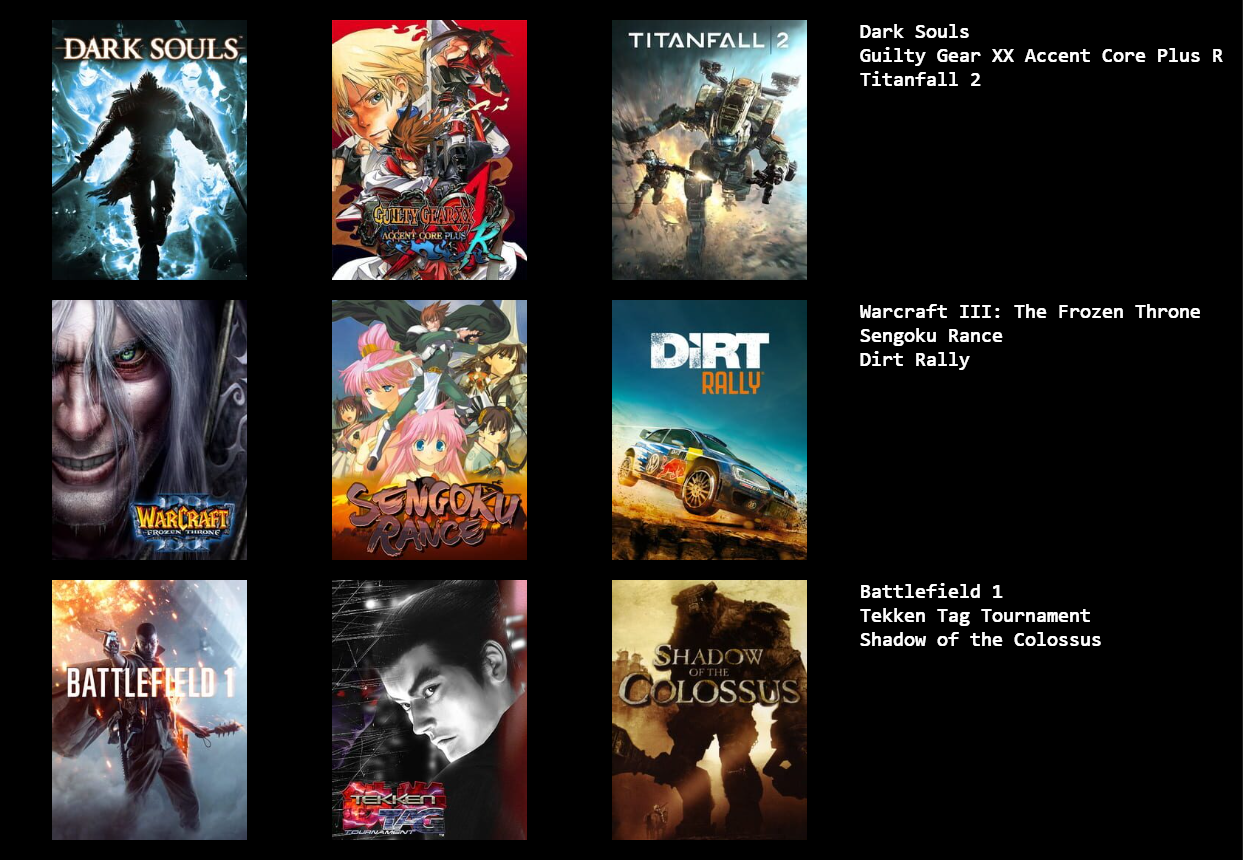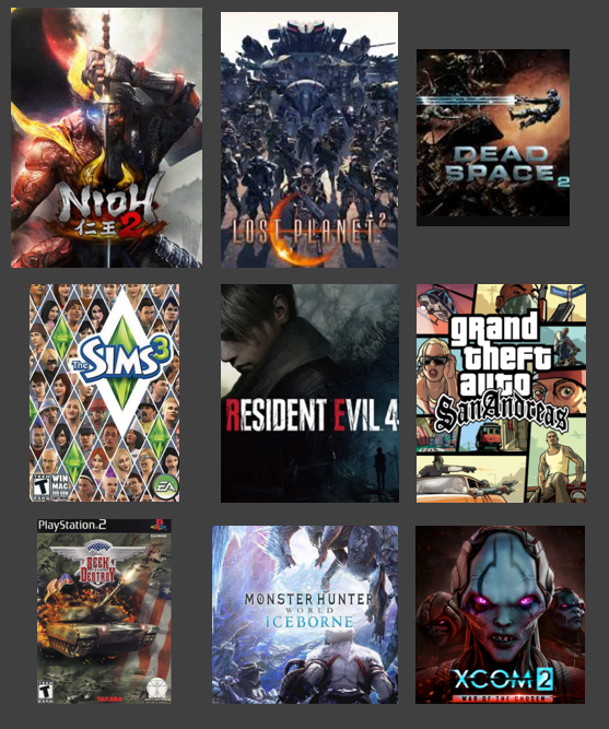 >Gradius Gaiden>Rance X>Ace Combat 7>Sims 3>Pokemon BW2>Gran Turismo 6>YGO Duelist of the Roses>Star Wars Battlefront 2>Hatsune Miku Project Diva F2ndAre these the greatest games ever made? No. But i enjoyed playing these the most and have very fond memories of them.