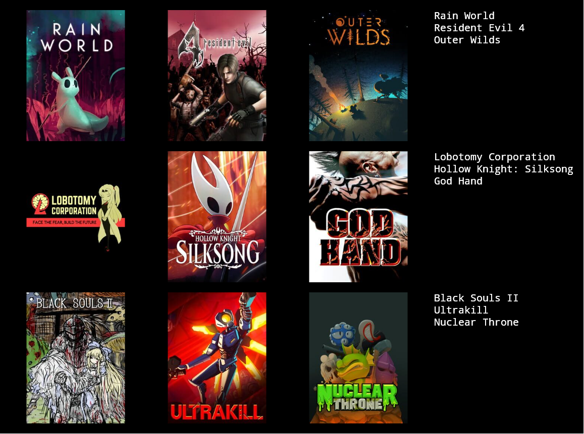 >>736245134If you removed silksong for a good metroidvania and outer shart for a good puzzle game you'd have solid taste.