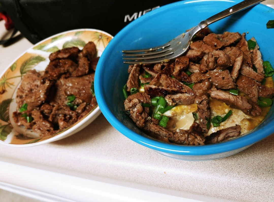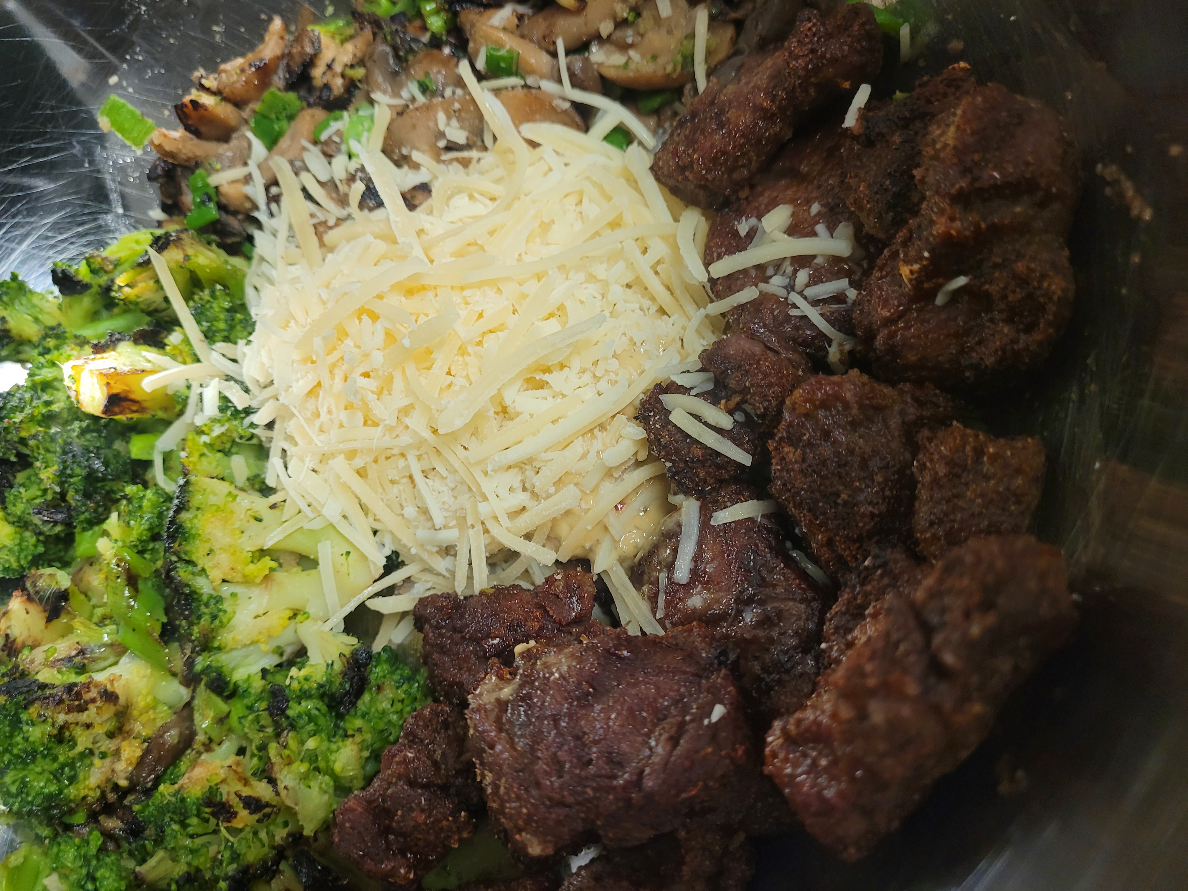Its falt iron steak, brocoli, and mushrooms with garlic parm sauce and parmesean in a giant bowl. You may think "that isn't gamer fuel that's a protein bowl" and you would be correct.>Stays warm fairly well>Doesnt get messy and only requires a fork>easy as fuck prep and clean up