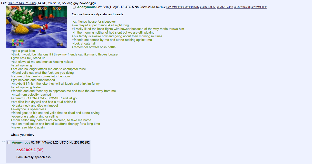 >>736243937> at friends house for sleepover>we played super mario 64 all night long>I really liked the boss fights with bowser because of the way mario throws him> in the morning neither of had slept but we are still playing>his family is awake now and going about their morning routines›friends cat comes by me and starts rubbing against me>look at cats tail|›remember bowser boss battle›get a great idea›think it would be hilarious if i threw my friends cat like mario throws bowser>grab cats tail, stand up›cat claws at me and makes hissing noises>start spinning›cat can no longer attack me due to centripetal force>friend yells out what the fuck are you doing> some of his family comes into the room> get nervous and embarrassed>maybe if i finish the joke they will all laugh and think im funny›start spinning faster>friends dad and friend try to approach me and take the cat away from me>maximum velocity reached>scream SO LONG GAY BOWSER and let go>cat flies into drywall and hits a stud behind it›breaks neck and dies on impact›everyone is speechless›friend goes to his cat and yells that its dead and starts crying>everyone starts crying or yelling>mom called (my parents are divorced) to take me home>put on medication and forced to attend therapy for a long time>never saw friend again