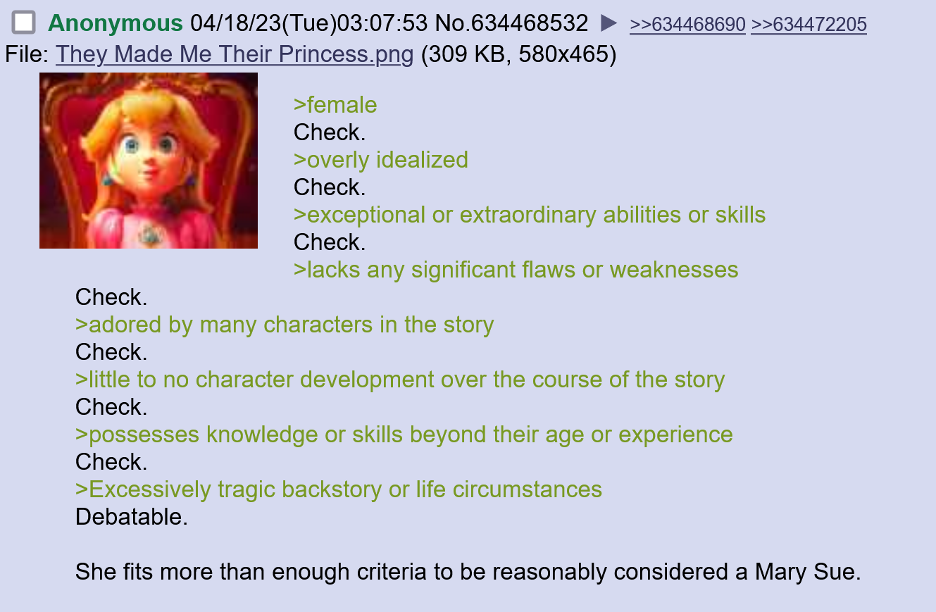 >>736250207>defies her personalitynot really. she's more than capable of fending for herself (see super mario bros 2). making her putting her in that role would render mario & luigi 100% redundant, howeverin the first movie she's hyper-competent. she was kicking everyone's ass single-handedly, with everyone powerless to stop her. the only reason she loses is because she gets distracted for a split-second while holding king bob-omb, who promptly detonates. this completely jeopardizes bowser's characterization as a credible threat and undermines the movie's entire conflict>>736262828>They can be Humans, beautiful ones even, with no strings attached. Yet choose to be disgusting.shrek is just a grump who wants to get all the fairytale characters out of his swamp. he falls for fiona as the movie goesso? the point is she isn't designed to overshadow the male lead like movie peach, the grrrrrrl power character (don't hit on me silly boys :3), is