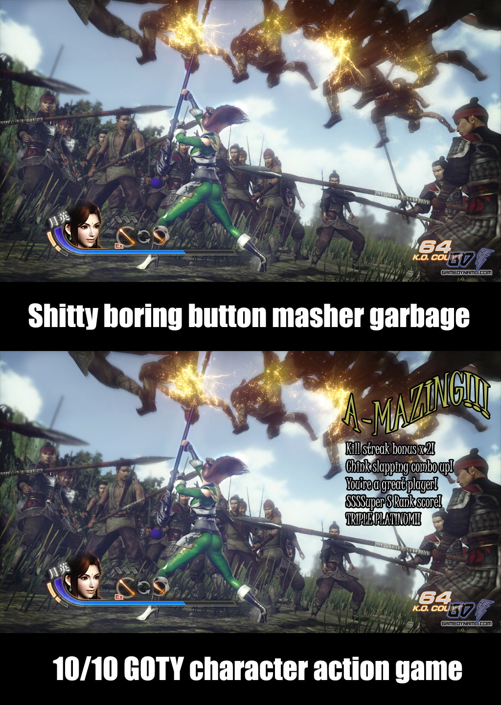 >>736255279I can't imagine being so stupid you believe the only problem with Dynasty Warriors is it doesn't have a style meter.