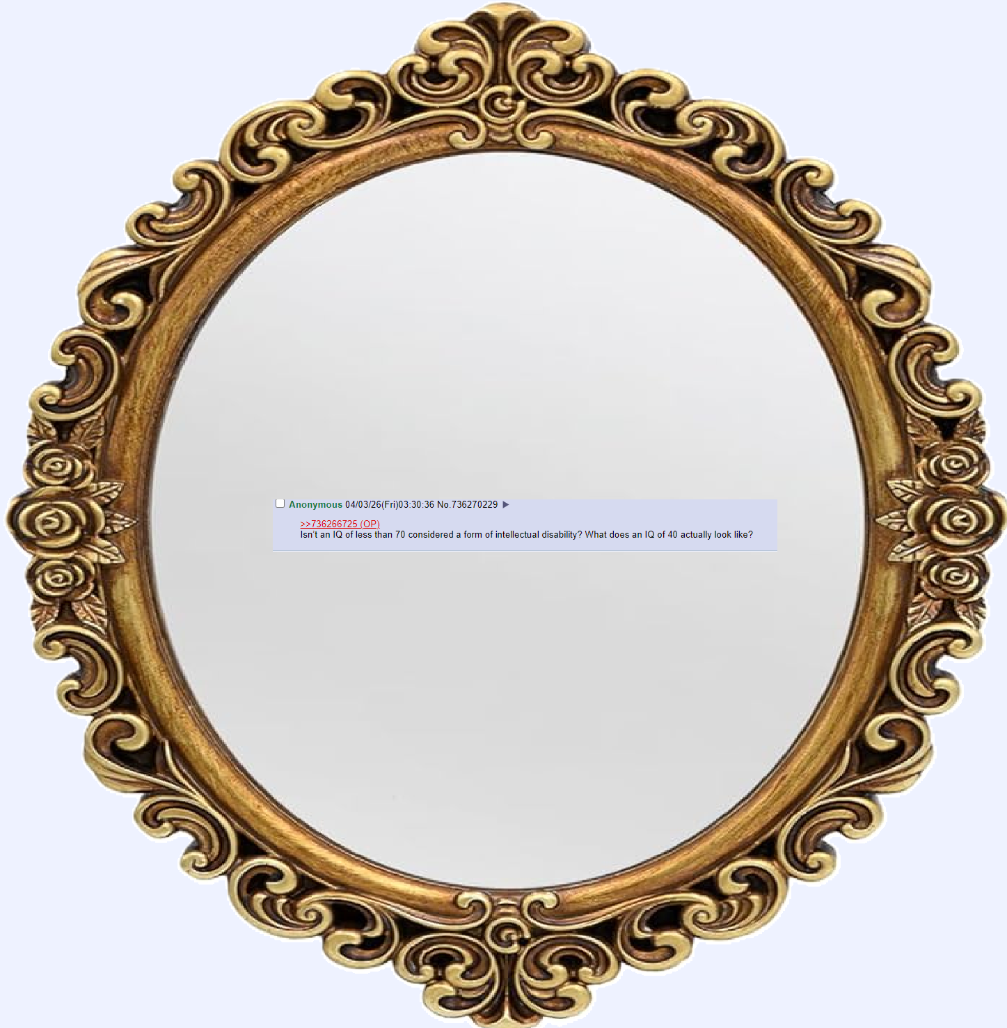>>736266725Isn’t an IQ of less than 70 considered a form of intellectual disability? What does an IQ of 40 actually look like?