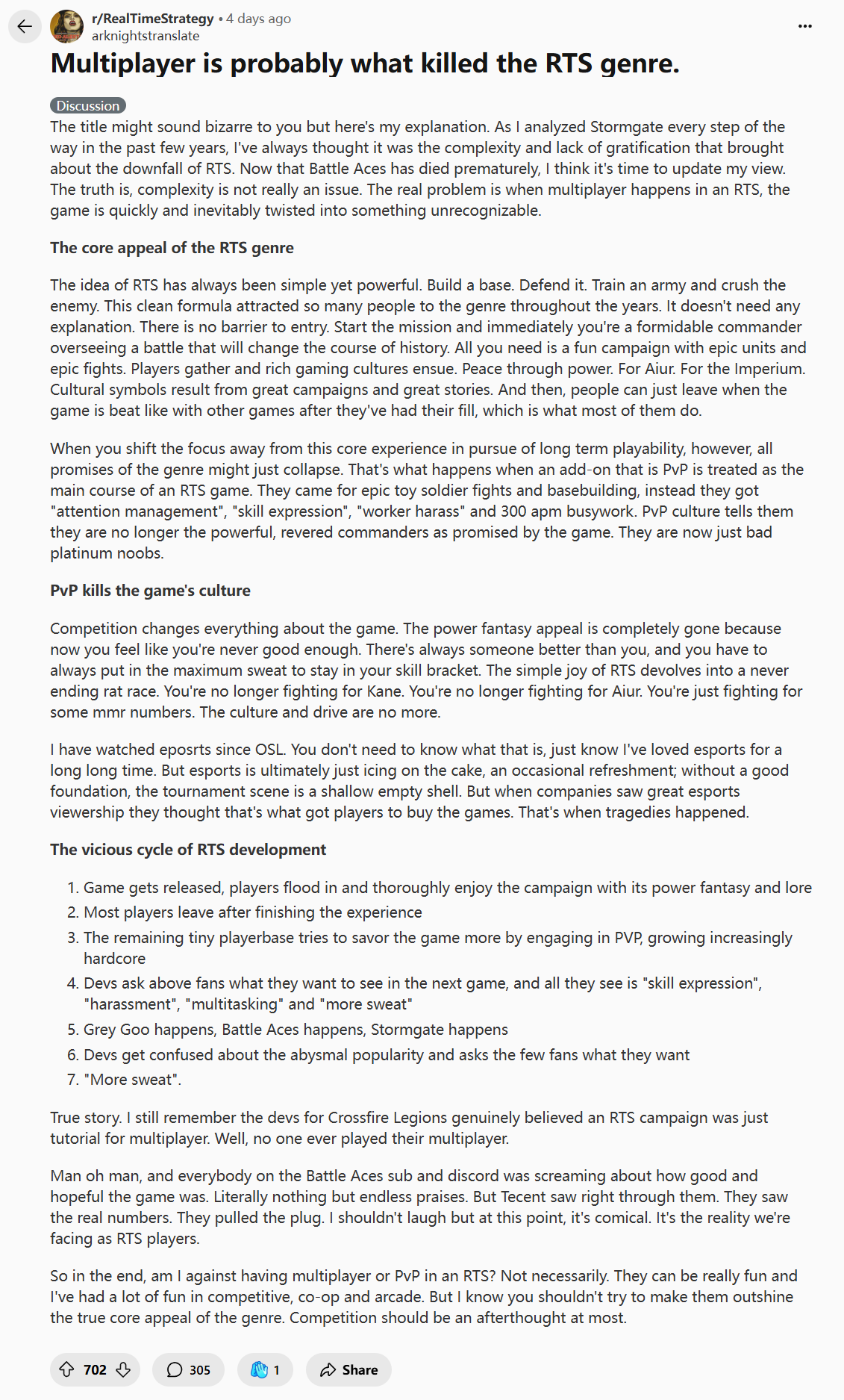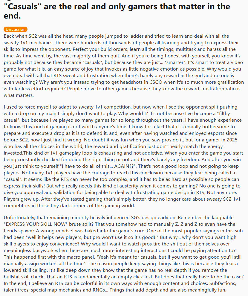 The thing with genres like RTS is that the appeal to normalfags, especially in the modern era where anyone can just download time wasting garbage like Vampire Survivors for 3 dollars and play that for 100 hours, is just not there. That leads to devs focusing on hardcore players, which in turn decreases the already small pool of casual players. Those casuals then turn around and bitch despite the fact that 99.99% of casuals would never play the game in question no matter how easy or approachable it is.