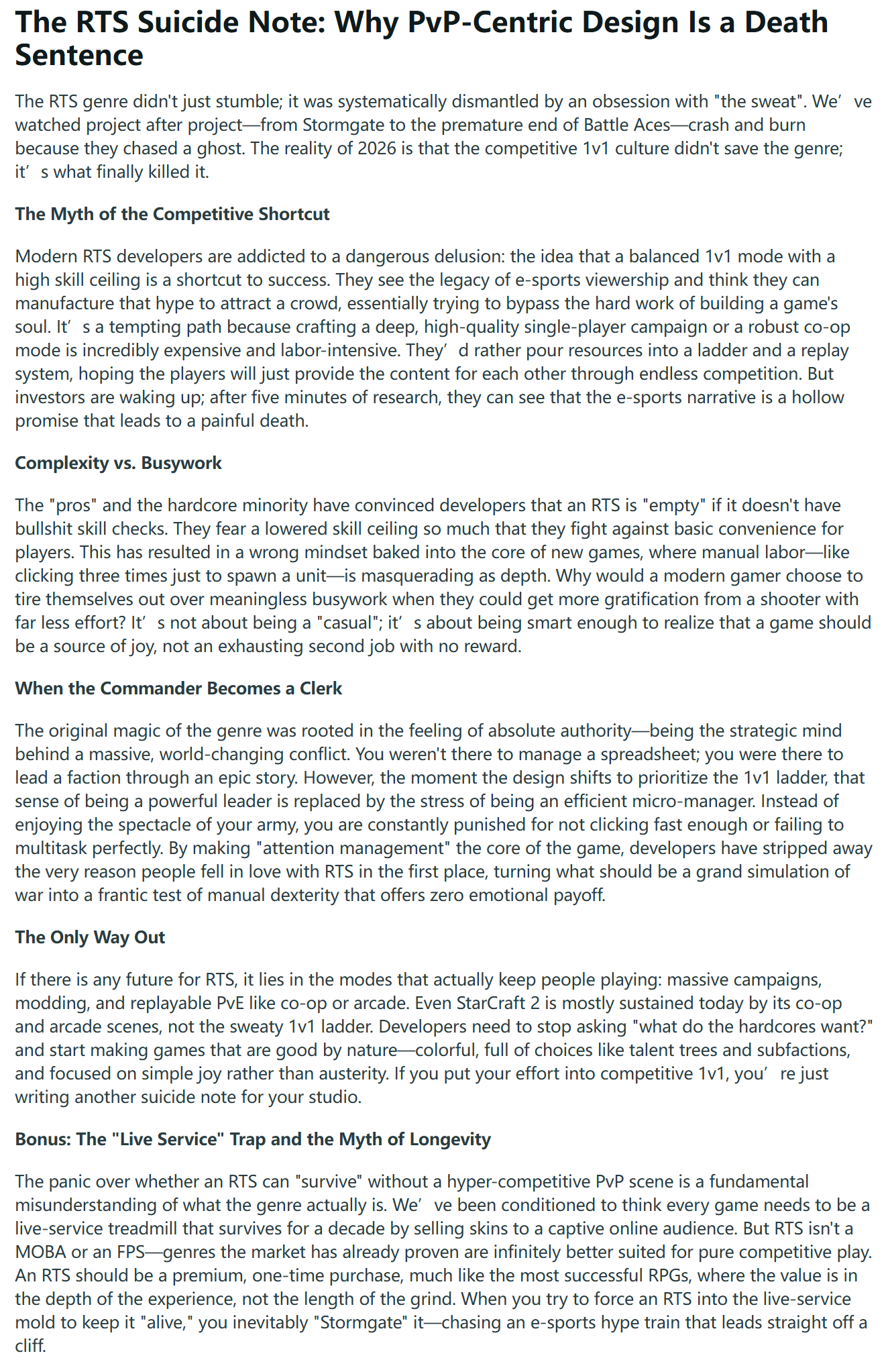 People who keep arguing about singleplayer vs multiplayer have internalized enshitification. RTS games didn’t have to pick which one to focus on, because they just used to have both. You could have your awesome singleplayer and robust multiplayer in one game.But then western AAA games didn’t have dev abandoned PC gaming in the late 00s and everything that couldn’t be streamlined to work on a Playstation or Xbox the way shooters were got axed. StarCraft 2 was the last big RTS success story because it was the last RTS with a budget.