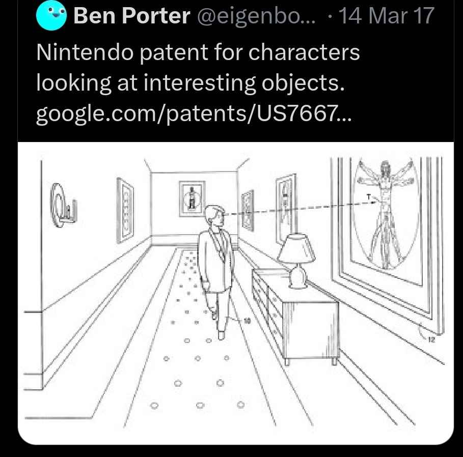 >>736286315>Your patent can be taken away if it can be proven that your idea is not original, in that someone already did it before but never patented it themselves.Yes but that requires fighting the patent in court, which requires money. In most cases it's safer to just avoid doing what's patented even if the patent is retarded.>If they genuinely tried to patent any NPC reacting to any object by turning to look at it, then it is no surprise it was rejected.That patent was actually granted, but it's old and expired a couple of years ago. But for 20 years you couldn't have NPCs turning their heads in games to look at interesting objects without licensing the patent from nintendo.