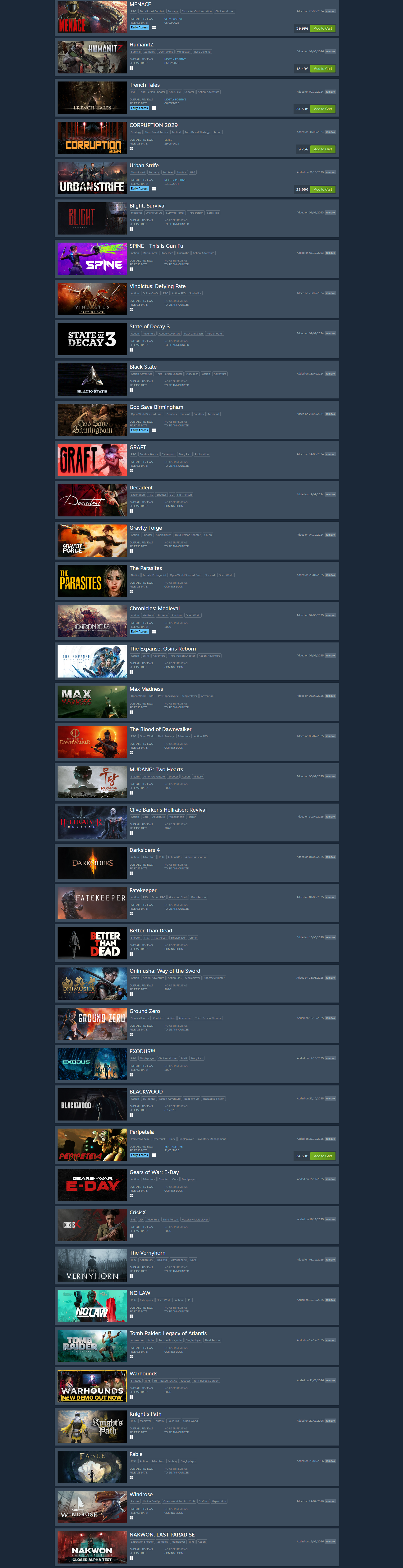 Long list of games that are either eternally early access or will never come out. Life is suffering.