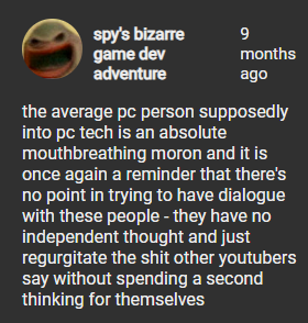 >>736324782>a team of like 8 guys could make an awesome 3D game with tech that’s way less efficient than what we have now.these guys are all unpaid and working a ton of it at the same time. thats why games were so fewer and far apart these days. they were also all masters in the field spy has to pay every single person that is involved in the production of his game other than himself