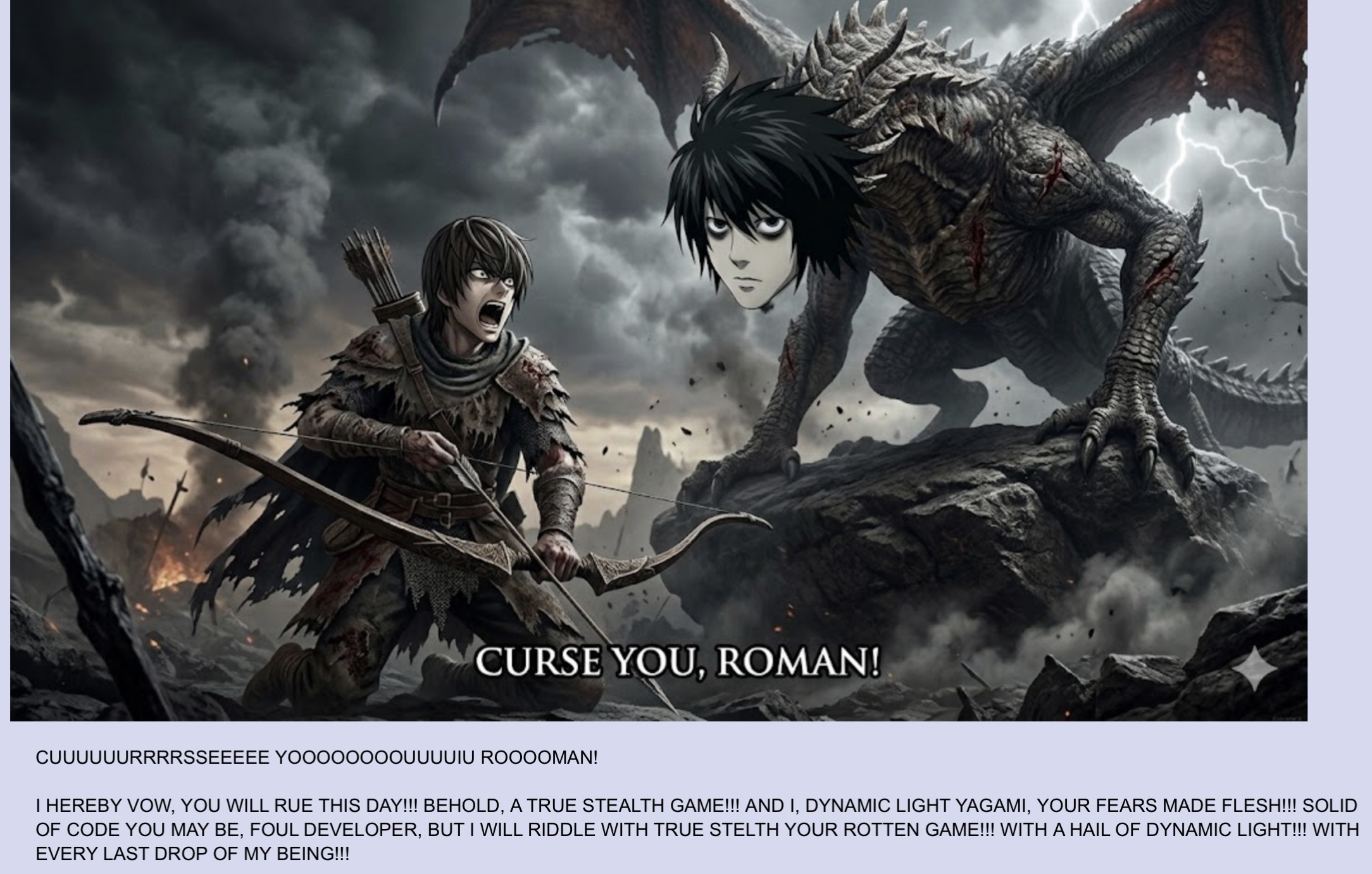 >>736322662tl;dr: some dude makes a thread rambling about how much he hates the IV dev because the game has "fake dynamic lighting" >spends basically an entire day rambling about how much he hates the dev and how much he hates the "fake dynamic lighting">doesn't just do this in one thread (the first of which actually hit the bump limit), he does it in another thread as well>gets dubbed Dynamic Light YagamiBasically it was two threads with hundreds of replies consisting of one guy going on about how much he hates the dev, people trying to explain that he has no idea what dynamic lighting is and trying to explain it to him, and other anons pretending to be the dev talking about raping him "dynamically" while posting pictures of the dev lifting weights and shit.