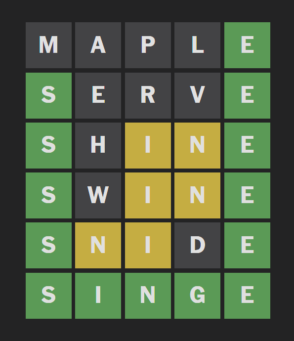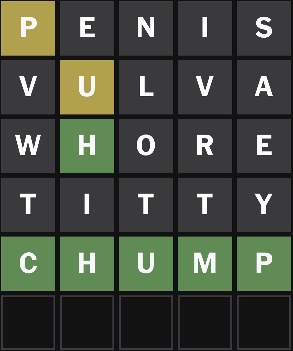 >>736311890no you're just an idiot thinking that knowing the vowels first is the best strategy. it's not because of moments like this where it limits the amount of words that can actually narrow down the answer on hard mode