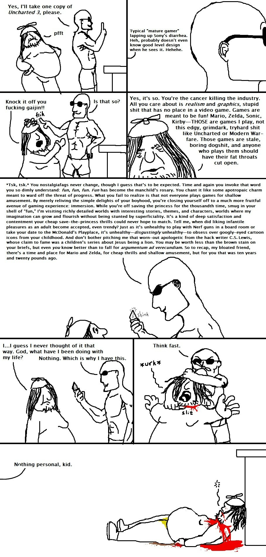 >>736325680First of all, I don't get mad, I get irritated and there is a difference between the two.Second, I never get irritated when the shit talk is authentic and by authentic, I mean not regurgitated by a YouTuber without any original thought added to it or said in a way that shows no intention of good-faith discussion but rather a cold, miserable malevolence meant to ruin what originally began as an enjoyable thread where fans of the game could get together to appreciate it.