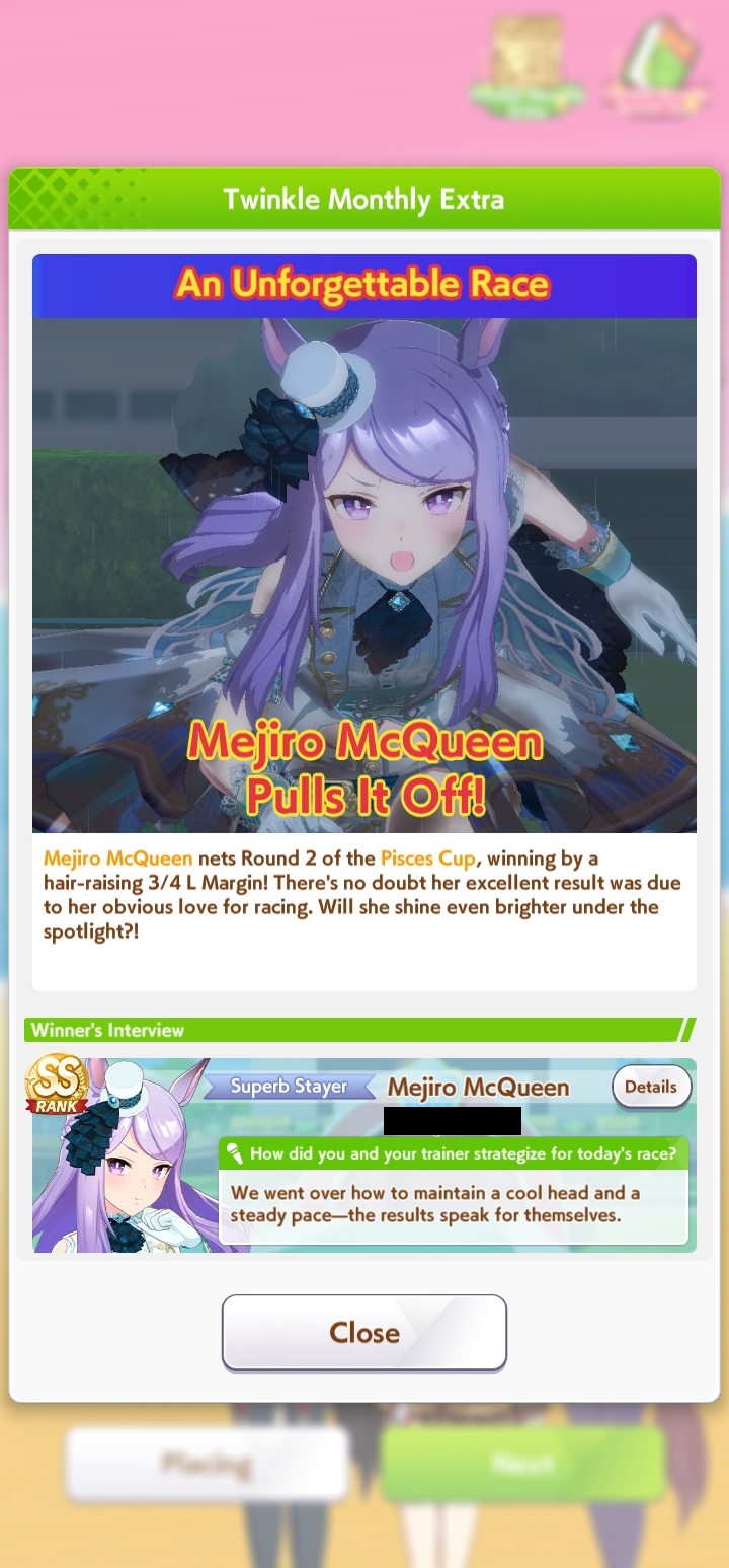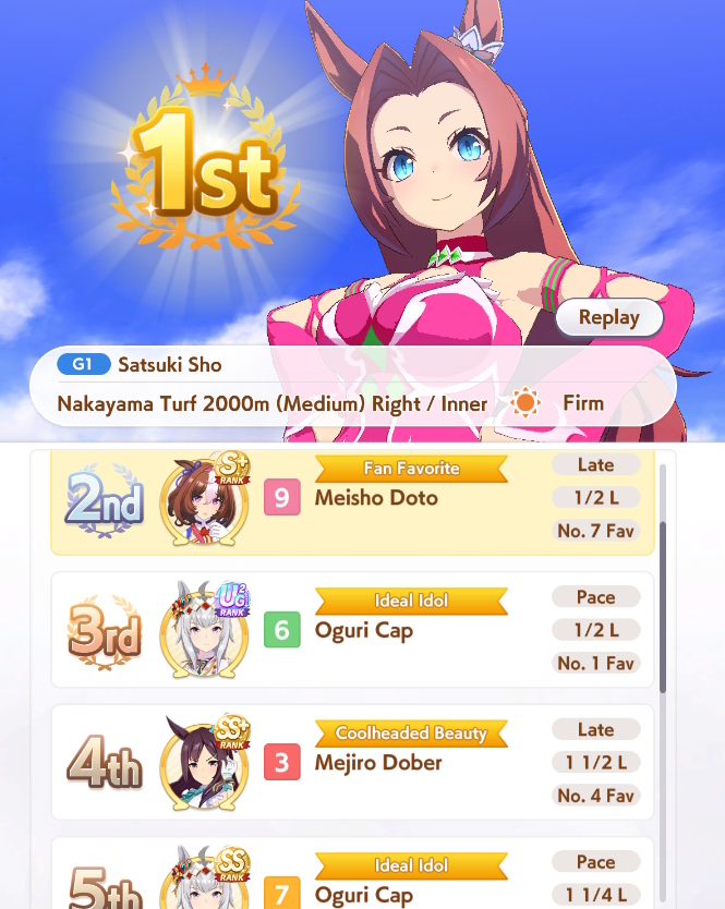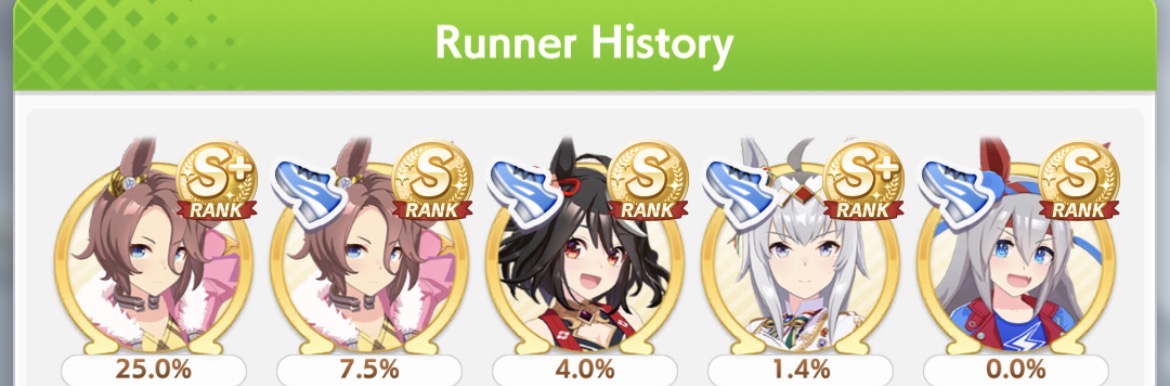 >>736350073Finished with something like an 80% winrate. You can always lose to bullshit, but I know that my girls have a real shot at making it this time around, not just collecting consolation carats.My biggest fear besides whales is being matched into a 6 front - 3 end lobby or something similar. Would strongly prefer if my rugpull uma could just run straight to the end without competition.
