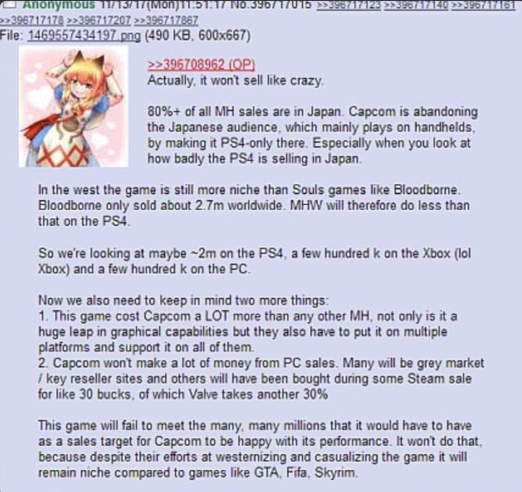 So much cope ITT World and Rise were vastly more popular than any previous Monster Hunter. Wilds should have exploded just by virtue of people wanting to keep playing MonHunBut it was a PS5-min-spec game in a market where the average card was still a GTX and the average consolefag was still on a PS4 (a state of affairs that hasn't changed, RTX/PS5 adoption is still pathetic, the entire "generation" failed to launch). The audience that wanted to buy it was priced out, and so the game underperformed and then died.I wouldn't be surprised if it doesn't get an expansion, if they just abandon Wilds and put out another Switch MonHun