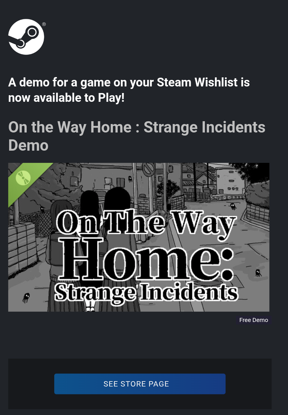 On The Way Home: Strange Incidents just got a demo according to my wishlist notifications. I will now proceed to play it.https://store.steampowered.com/app/4330780/On_The_Way_Home__Strange_Incidents/
