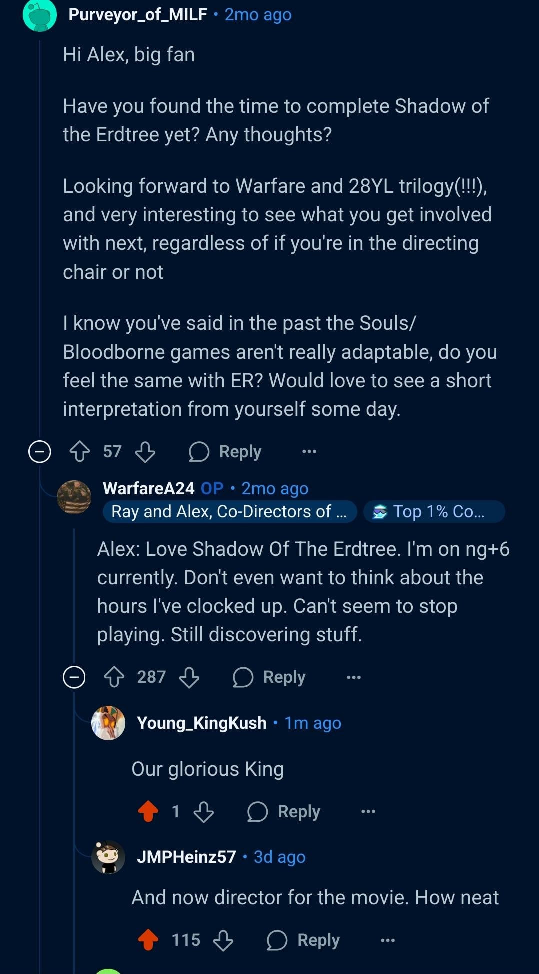 One thing Garland absolutely has a handle on is a dense atmosphere. He's a mixed bag writing wise but all his directed films so far, and his show DEVS have great aesthetics, sound design, and musical scores (albeit usually synth based, Elden Ring presumably wouldn't be), so I expect it to nail the dark fantasy look and feel. If it's just a straightforward, contained story set in the world and doesn't try to adapt the whole game it could be an enjoyable time.