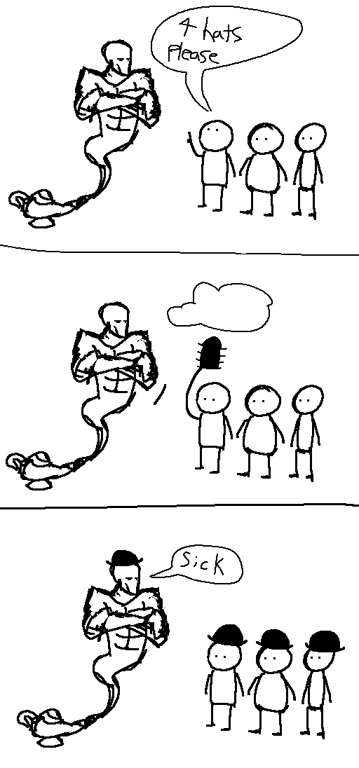 >>736360262>I wish for my desire to be heard granted upon the fulfillment of the other two's wishes. >no conditionalsThen I opt out and allow the other 2 to kill each other, then I take the lamp for myself.Another alternative is...>Hey guys, if you just wish for the genie's power to grant wishes, then you won't need the genie, and you can just grant your own wishes for the rest of your lives.